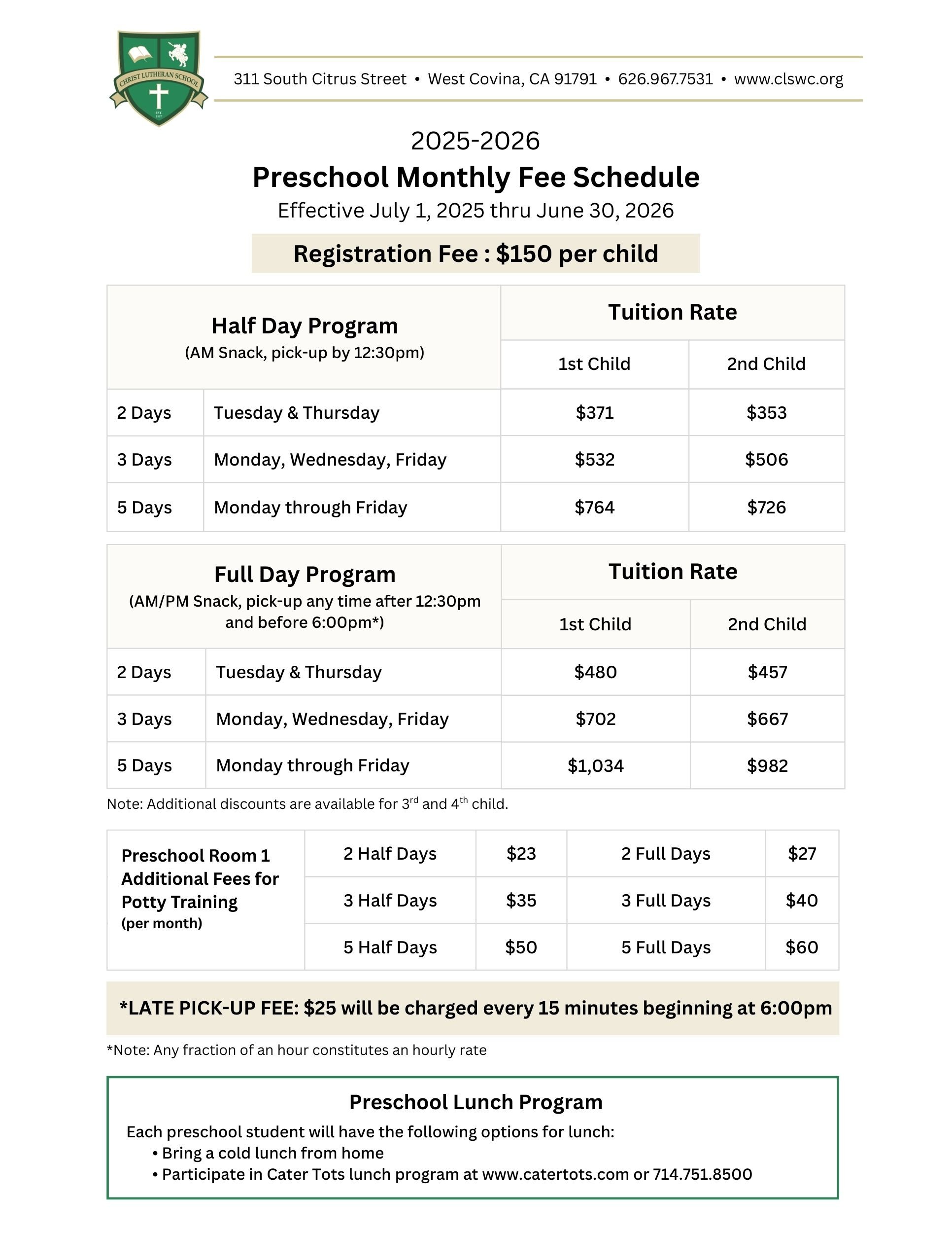 • Pay the $150 Registration fee per child upon enrollment (non-refundable)